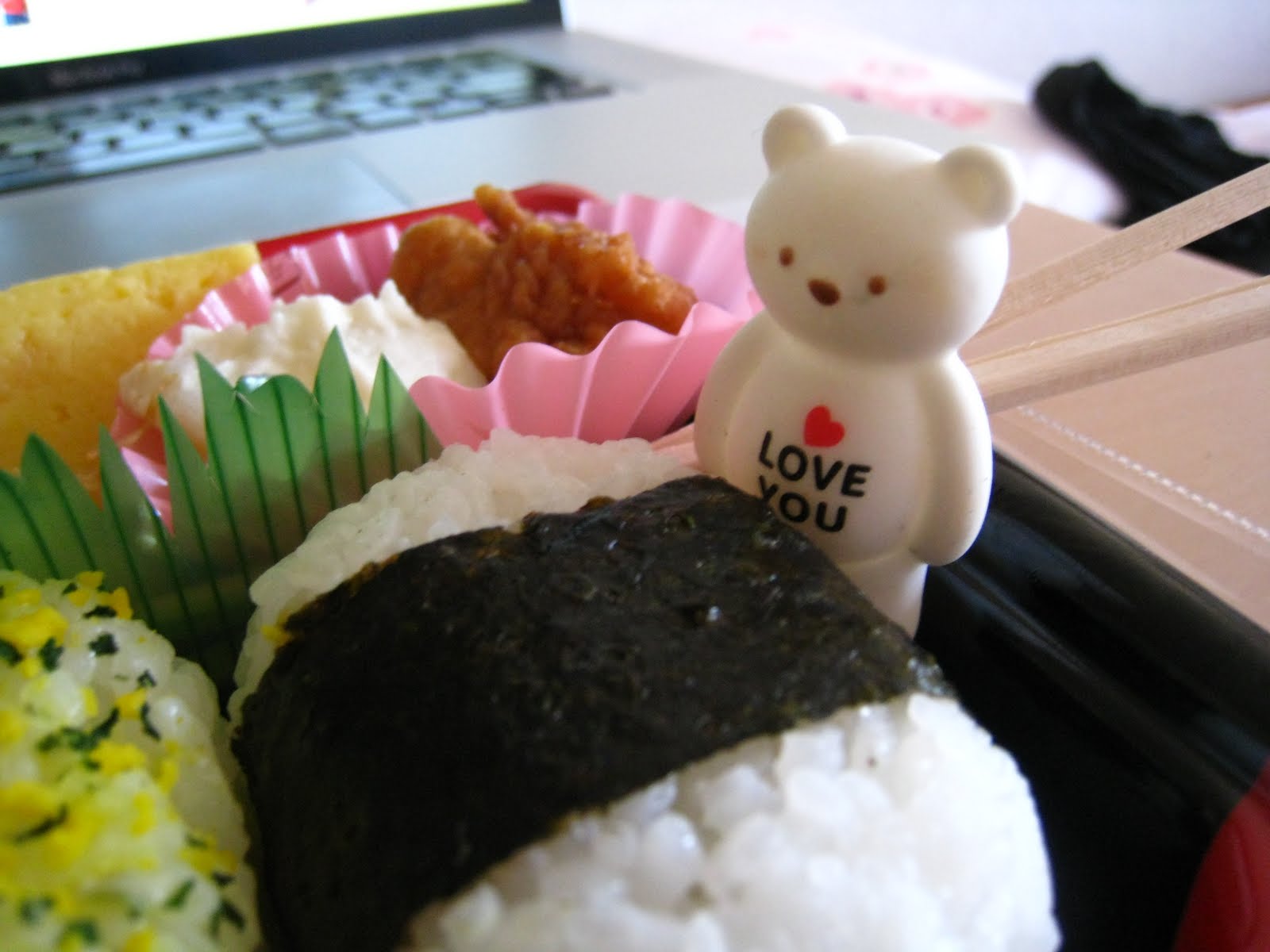 Today, Rabu-Beah-san hid in the bento box I bought at the Lawson 100. That's a shop where almost everything is 105 yen! Very convinient. Rabu-Beah-san *loves* sticky rice. But he still loves you more.